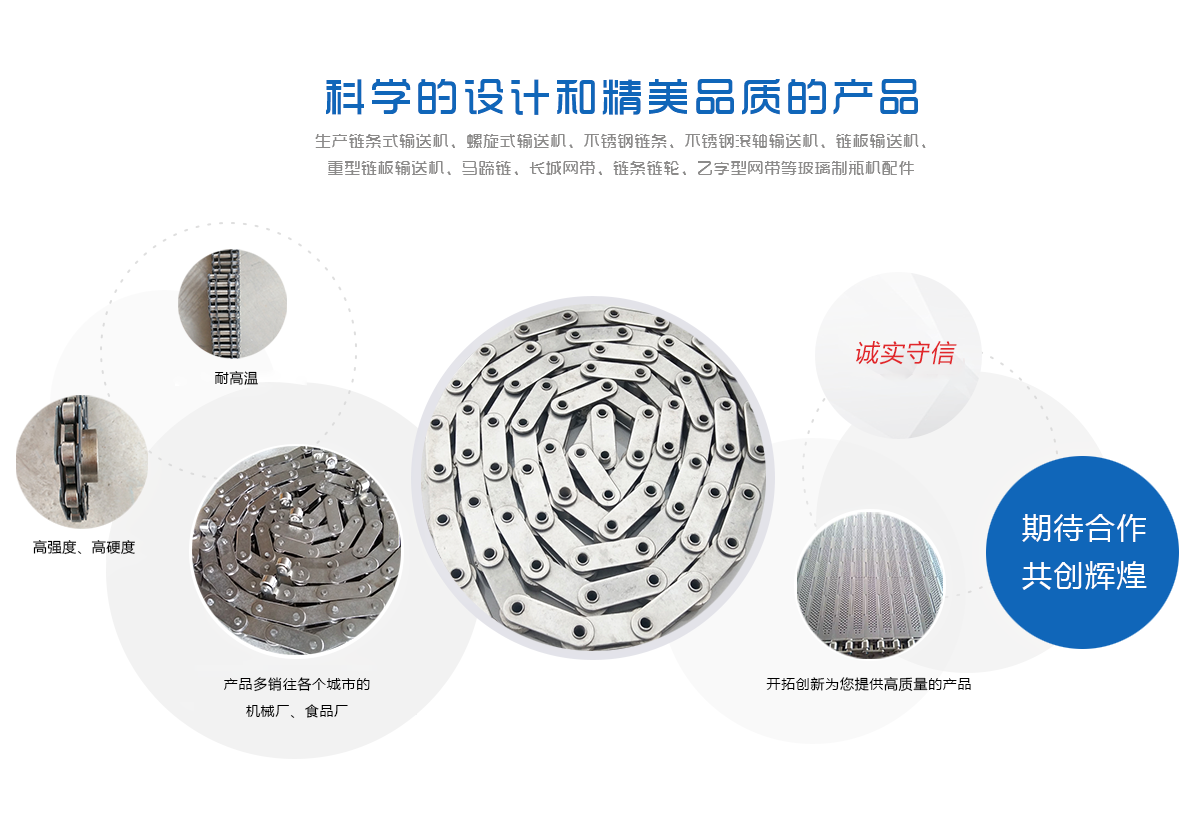 生產(chǎn)鏈條式輸送機(jī)、螺旋式輸送機(jī)、不銹鋼鏈條、不銹鋼滾軸輸送機(jī)、鏈板輸送機(jī)、重型鏈板輸送機(jī)、馬蹄鏈、長城網(wǎng)帶、鏈條鏈輪、乙字型網(wǎng)帶等玻璃制瓶機(jī)配件,食品機(jī)械配件及各種網(wǎng)帶的專業(yè)廠家 ,多年來產(chǎn)品暢銷各地玻璃廠和食品廠,在玻璃制品等行業(yè)中享有較高的聲譽(yù)。公司集摸具開發(fā)、機(jī)械設(shè)計(jì)生產(chǎn),銷售于一體的生產(chǎn)型企業(yè)。生產(chǎn)的自動化流水線金屬傳動網(wǎng)帶、鏈條等產(chǎn)品廣泛用于玻璃機(jī)械、食品機(jī)械、化纖機(jī)械、醫(yī)藥、電子、烘干機(jī)械、輪胎機(jī)械等行業(yè)。產(chǎn)品多銷往各個城市的機(jī)械廠、食品廠和一些涉及流水線或自動化設(shè)備的公司。